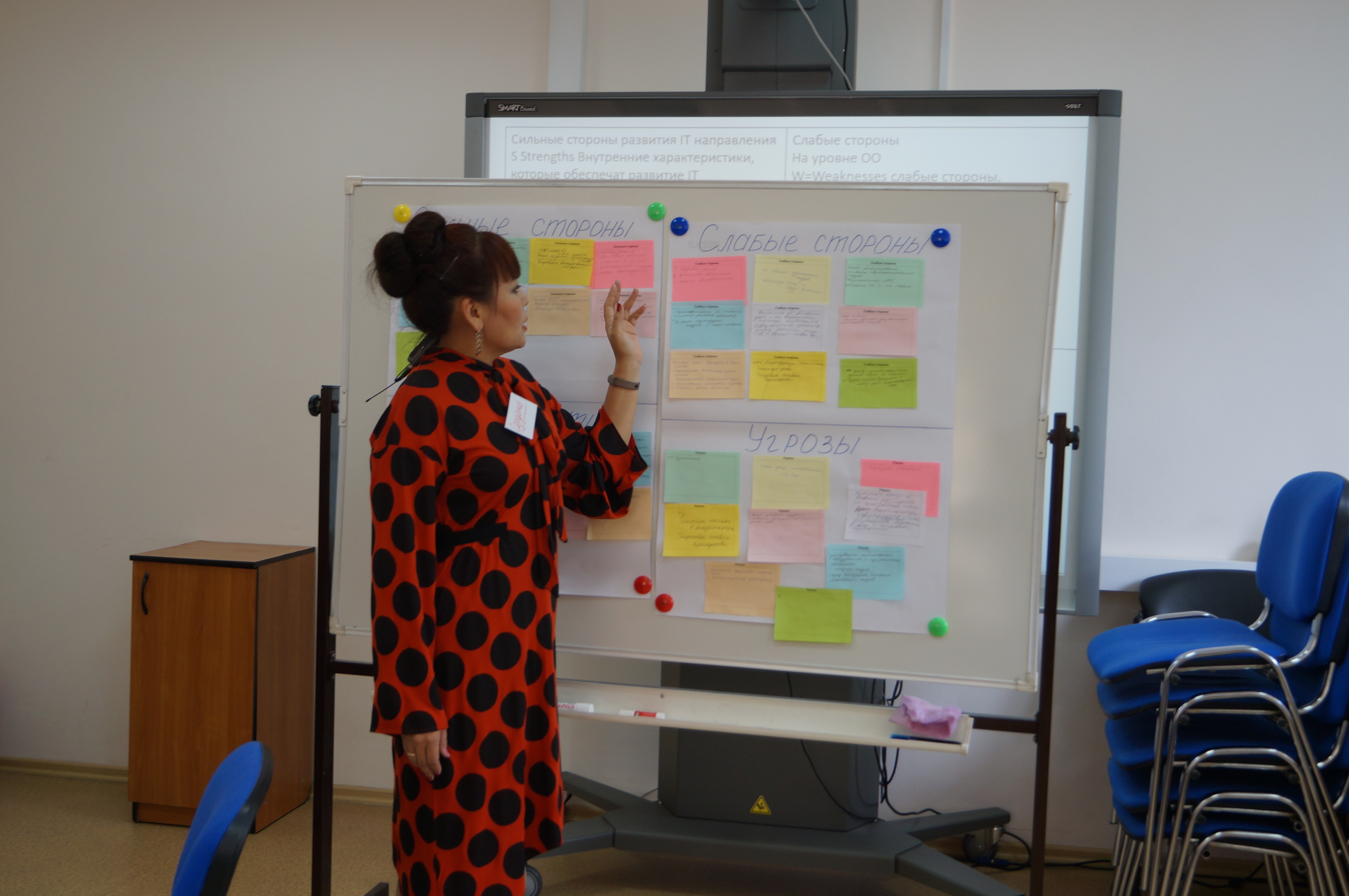 Целью сессии была сформировать сетевую команду на региональном уровне, которая отработает в этом учебном году модели развития IT–направления в регионе. Участники сессии активно работали по командам в течение полутора часов, обсудили и сформировали единое понимание современных трендов цифрового образования, оценили сильные и слабые стороны, возможности и риски проекта, создали примерную дорожную карту на этот учебный год, в которой отразились технологии, явления, процессы, форматы и события, которые можно осуществить в течение года, а также ресурсные возможности образовательных организаций, с которыми они готовы делиться, рассмотрели риски и угрозы, негативно влияющие на развитие IT-направления в регионе, пути их минимизации.
